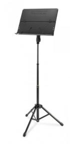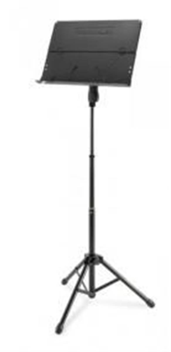 Pupitre orchestre pliant avec plateau aluminium plein. Plateau pliant et inclinable, garde-page, adaptateur EZ, poignée et système coulissant 3 sections EZ, trépied (plateau : 48 x 34.5 cm, hauteur : 61 - 115 cm, poids : 3.2 kg).