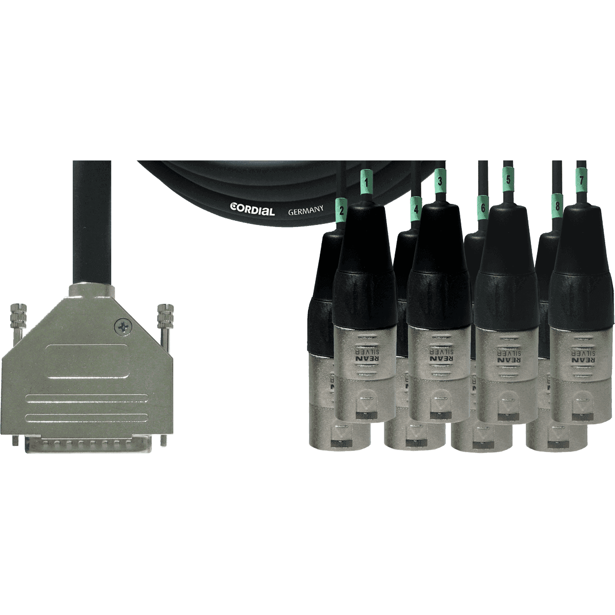 ConnecteursSub-D 25 broches / 8 XLR mâlesFichesREAN (Sous licence Neutrik)Longueur5 mètresDescription du câbleCâble Cordial CMD8  ? Section de câble : 1x .14mm²  ? Composition : 8 paires torsadées  ? Conducteurs : 18x .1mm  ? Résistance : 13 ?/