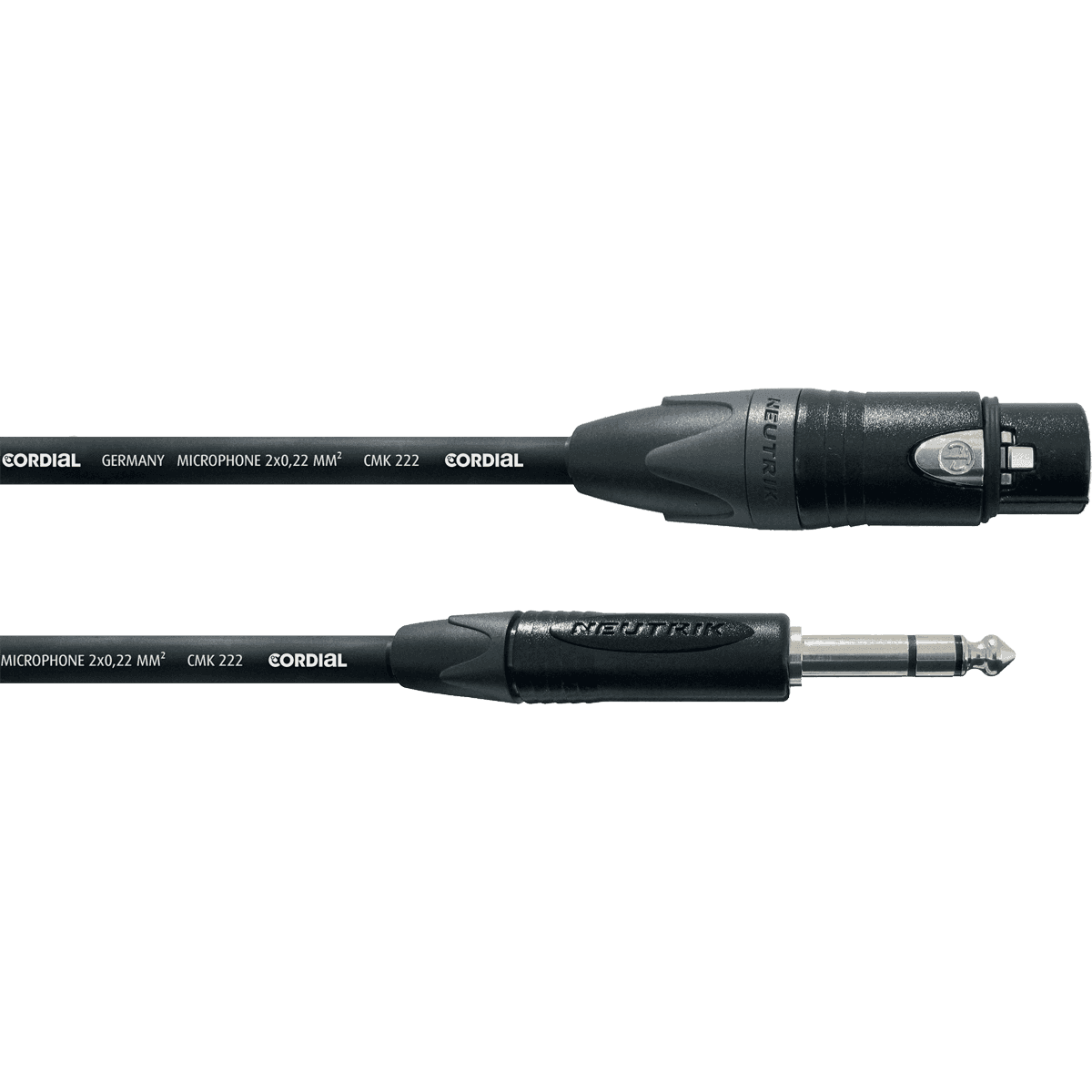 ConnecteursXLR femelle / Jack stéréo mâleFichesNeutrik noirLongueur2.5 mètresDescription du câbleCâble Cordial CMK222 fabriqué en Allemagne  ? Section de câble : 2x .22 mm²  ? Conducteurs : 28x .1mm cuivre nu  ? Résistance : 85?/km  ? Capacité