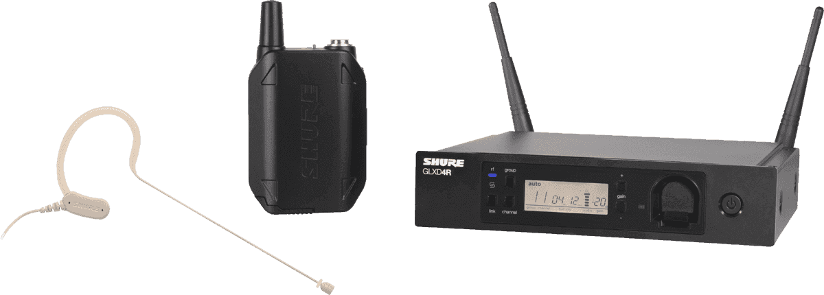 Système complet simple pour animateurs et conférenciers. Composé d'un récepteur GLXD4R, d'un émetteur ceinture GLXD1 avec accu SB92 et d'un micro tour d?oreille statique omnidirectionnel couleur chair MX153T-O-TQG.