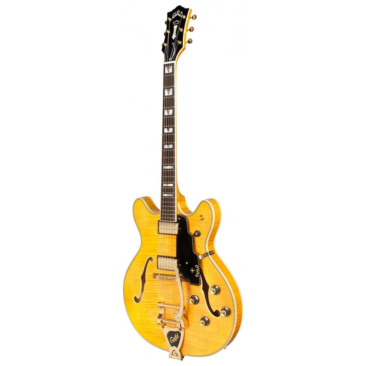 Doté de la forme emblématique du corps Starfire double Cutaway de Guild, le Starfire VI a une superbe table, dos et éclisses en érable flammé AAA et un bloc central massif. Les micros doubles LB-1 Little Bucker, répliques des micros humbucker de plus petite taille des années 1960 de Guild, offrent une gamme de sons bien adaptés à une variété de styles de jeu et de genres. Le Starfire VI a un manche en trois parties (érable/noyer/érable) et une touche en ébène avec incrustation de blocs en V en nacre et en ormeau. Il comprend également un chevalet Tune-o-Matic avec une base en ébène, d'un acastillage doré, de filets noirs et ivoires à 5 plis et d'un cordier à Guild Vibrato. Elle est disponible dans une finition blonde brillante et comprend un étui rigide. La Starfire VI Guild la plus luxueuse sur le marché, a le look, le ton et la sensation vintage que vous ne pouvez obtenir qu'avec une Starfire Guild.