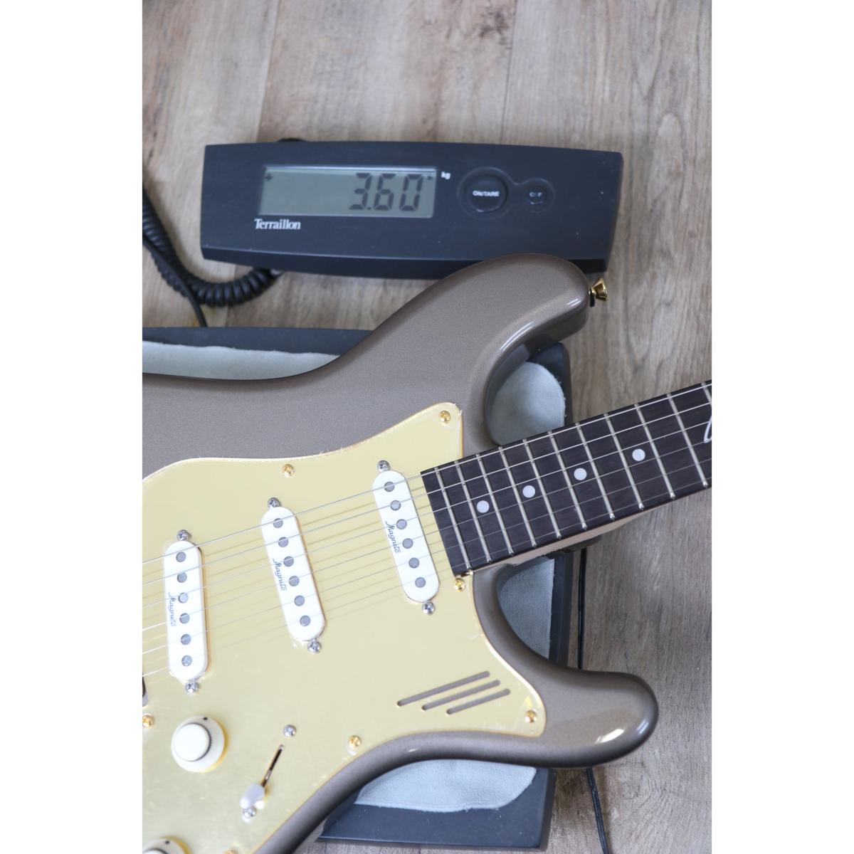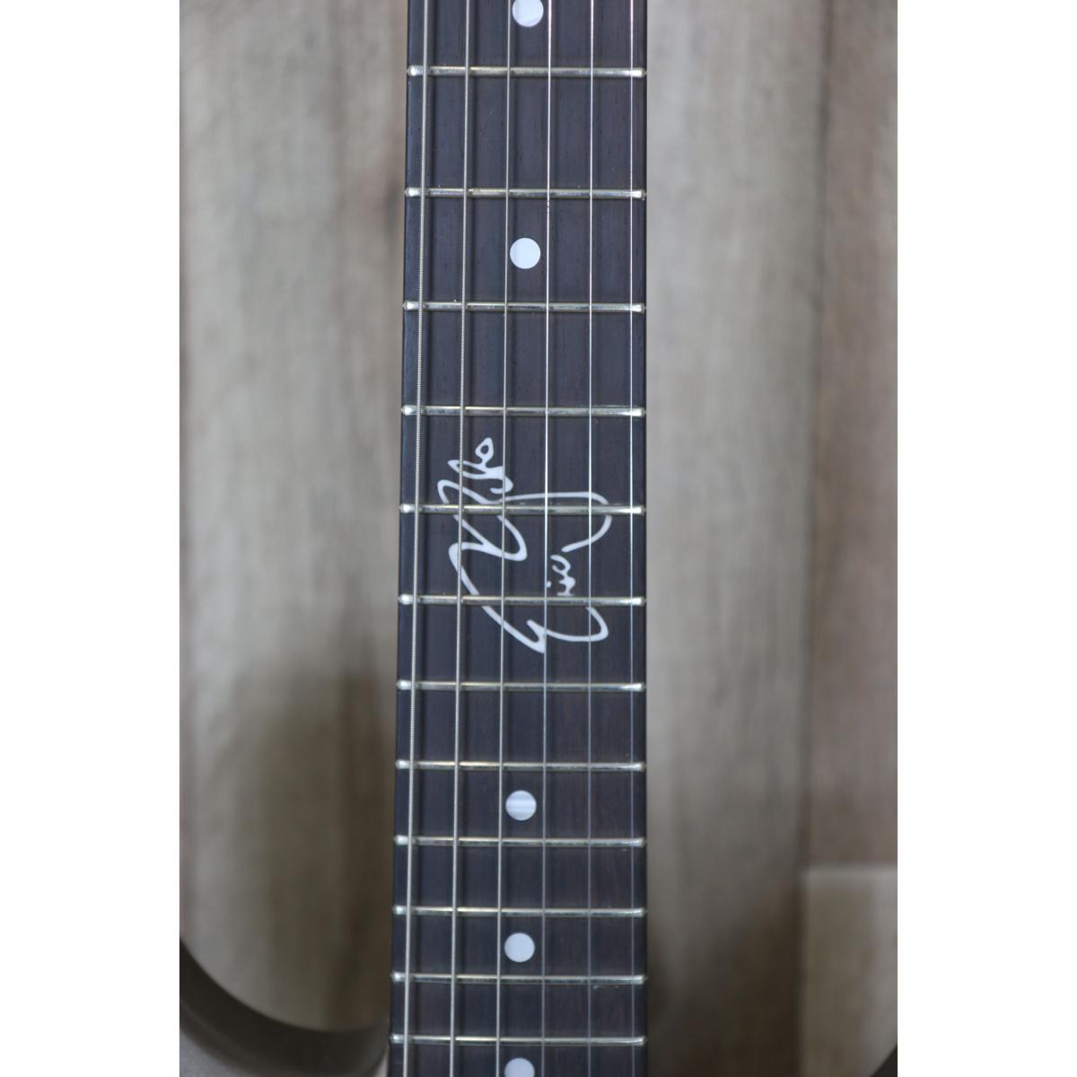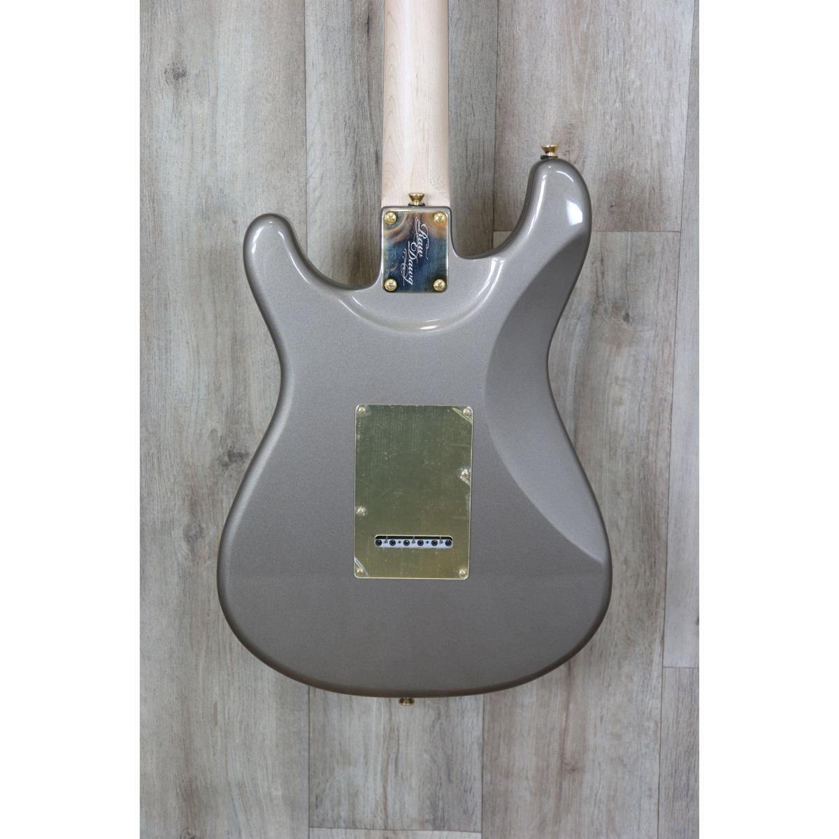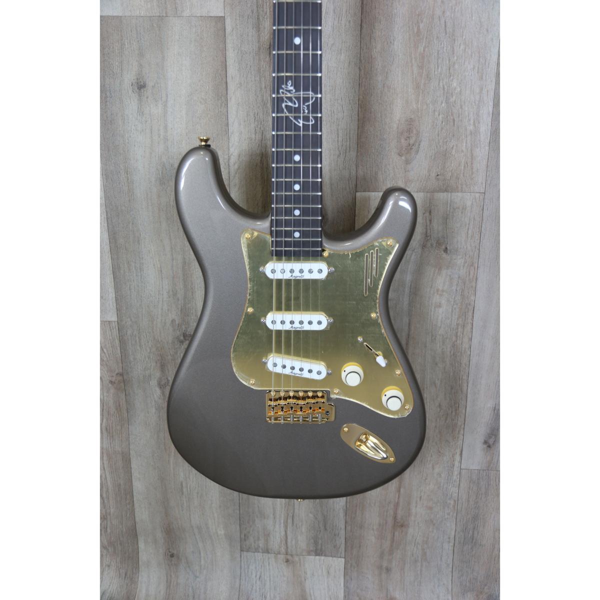 Cette guitare signature possède un corps 2 pièces en aulne américain, une touche en Palissandre de radius 305mm ainsi qu’un manche en Erable au profil C et une finition Light Mercury Silver équipée de pièces en or et de 3 simples bobinages personnalisés (Lollar Blackface Neck, Middle & Bridge Single Coils).
