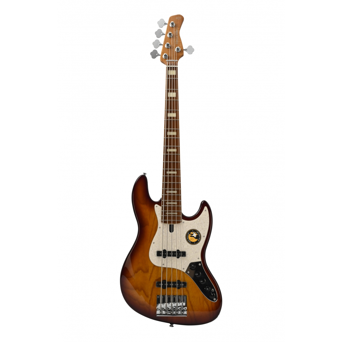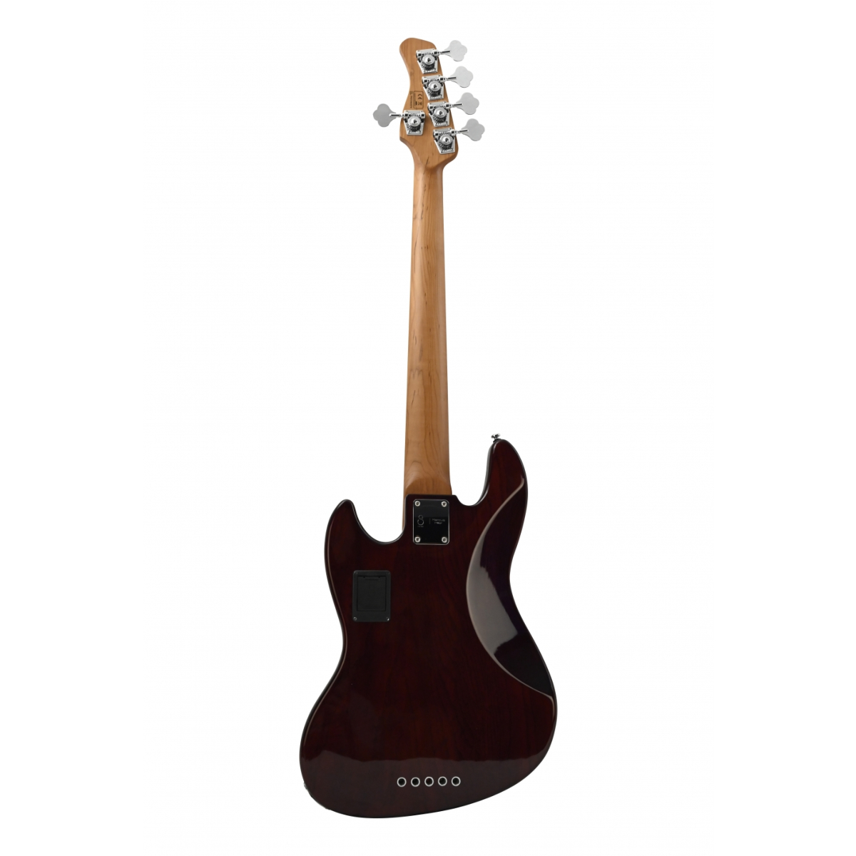 La basse 5 cordes M. MILLER V8 Swamp Ash-5 TS MN adopte une forme Jazz, un corps en Frêne des Marais, un manche en Erable torréfié satiné et une touche en Erable torréfié, le tout magnifié par une finition Tobacco Sunburst.