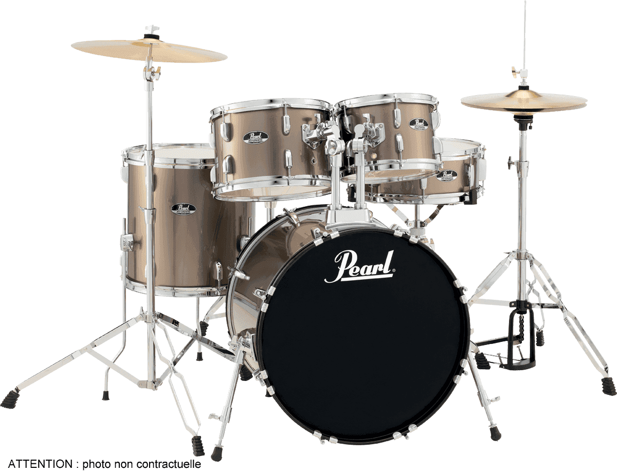 - Accessoires : 1 pédale de grosse caisse P-50, 1 siège D-50, 1 set de cymbales Pearl (hi-hat 14 et crash/ride 16), 1 paire de baguettes et 1 housse de baguettes