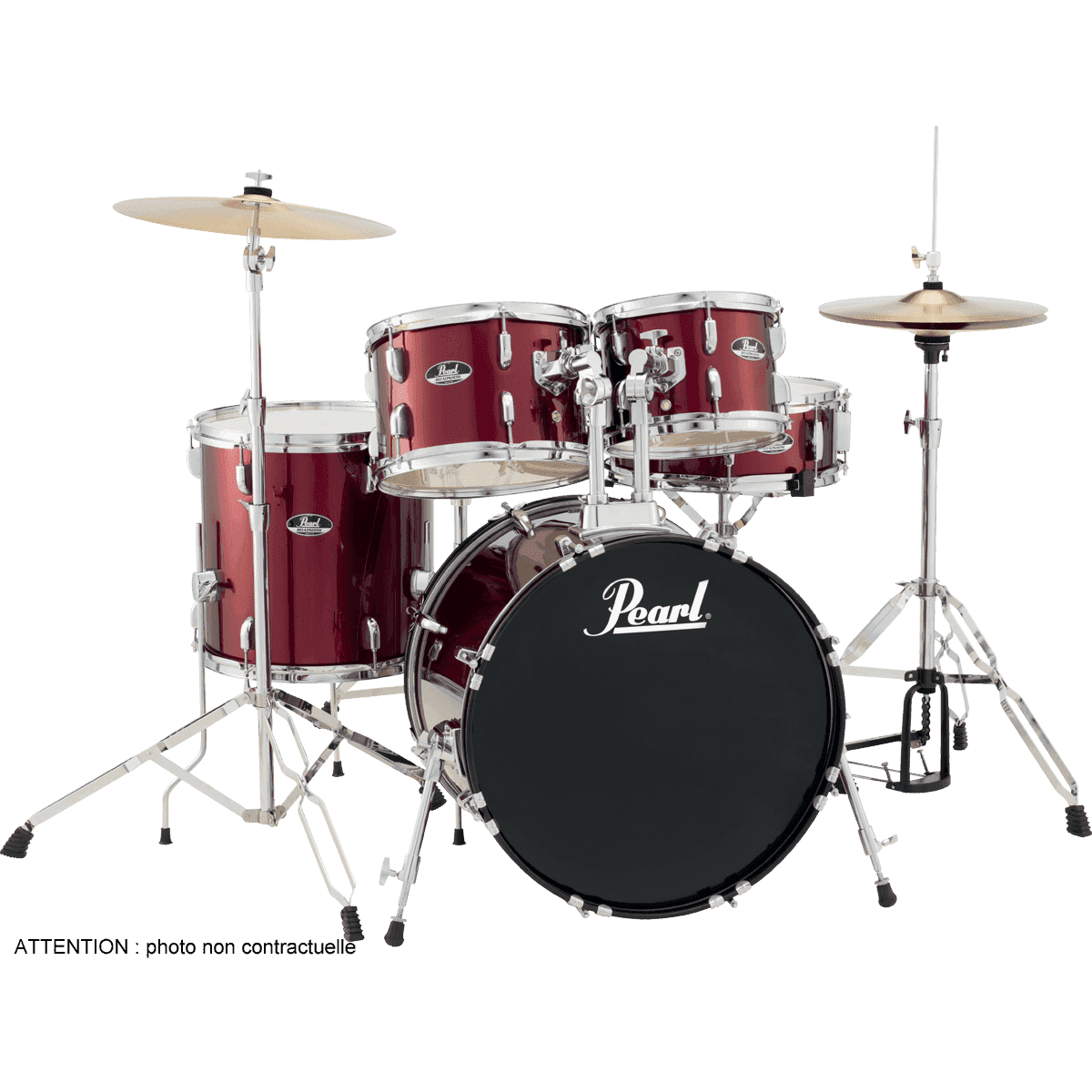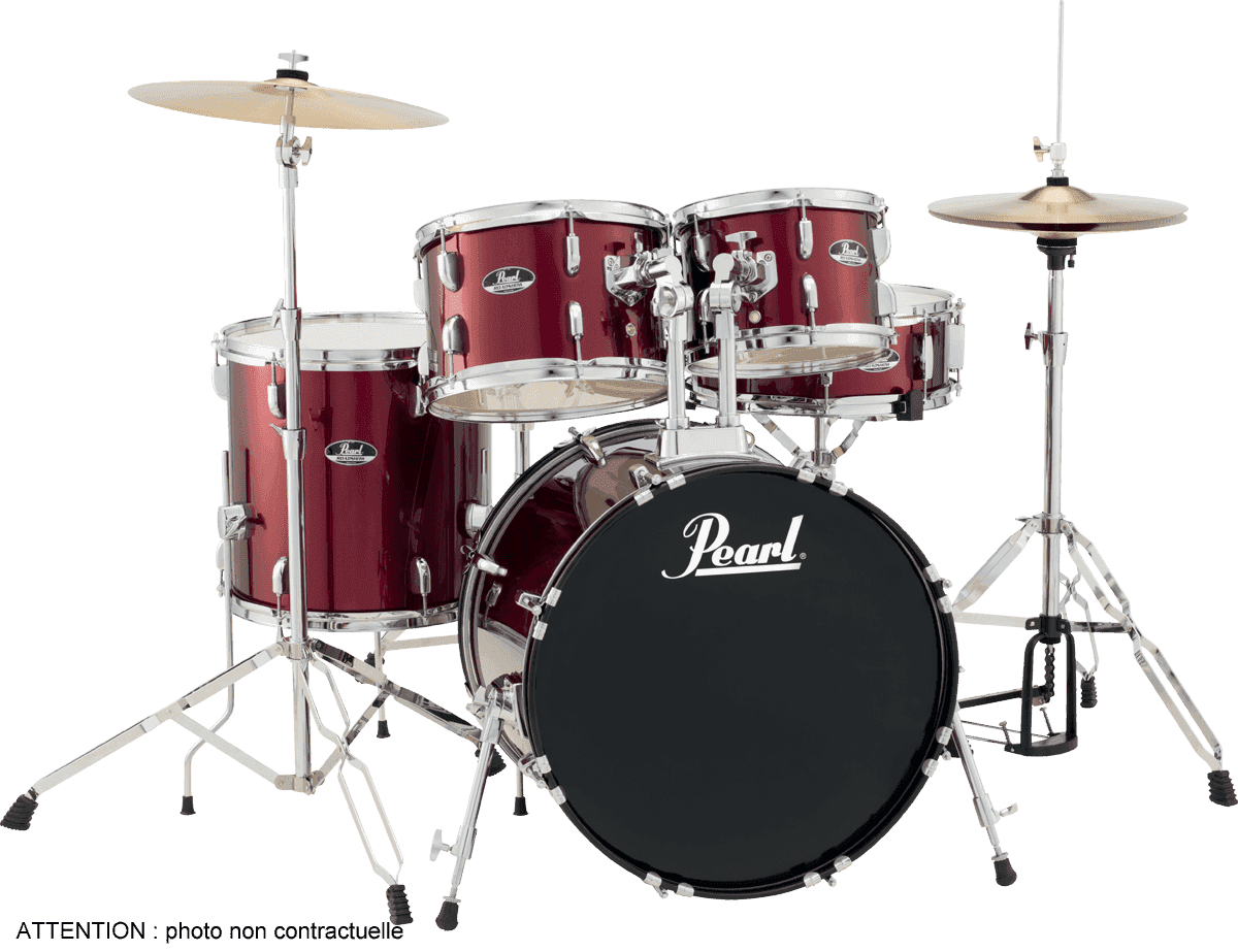 - Accessoires : 1 pédale de grosse caisse P-50, 1 siège D-50, 1 set de cymbales Pearl (hi-hat 14 et crash/ride 16), 1 paire de baguettes et 1 housse de baguettes