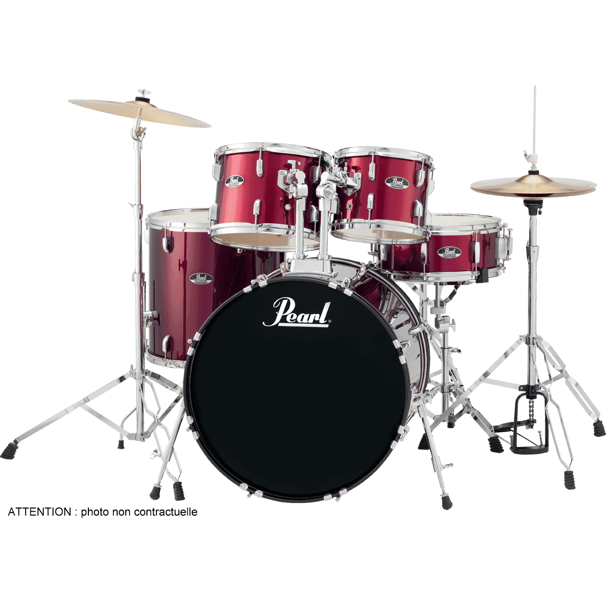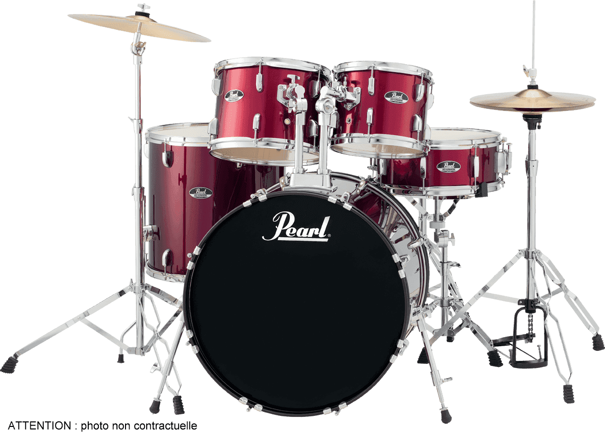 - Accessoires : 1 pédale de grosse caisse P-50, 1 siège D-50, 1 set de cymbales Pearl (hi-hat 14 et crash/ride 16), 1 paire de baguettes et 1 housse de baguettes